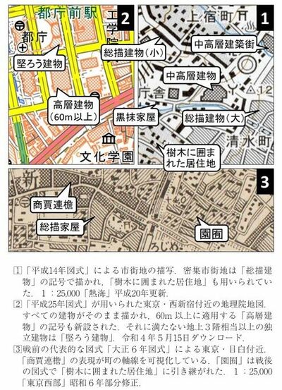 なお3階建て以上に用いた「高層建築街」は、都市の高層化がさらに進んで実態にそぐわなくなったため「昭和61年図式」から「中高層建築街」に改められた。