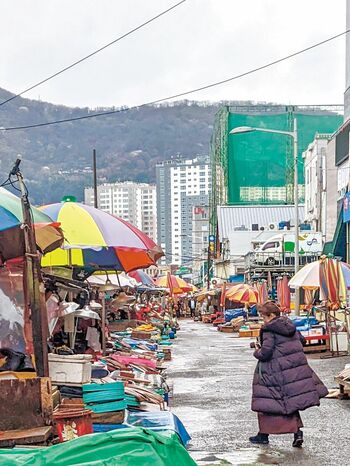 釜山(プサン)などの海に面した町では、早朝の市場に行くと、採れたての生のりや昆布、わかめなどが新鮮な魚介とともに勢いよくずらりと並んでいます。