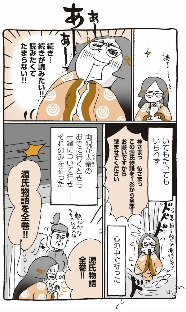 はしるはしる、わづかに見つつ、心も得ず心もとなく思ふ源氏を、一の巻よりして、人もまじらず几帳(きちやう)の内(うち)にうち臥(ふ)して、引き出(い)でつつ見る心地、后(きさき)の位も何にかはせむ。昼は日ぐらし、夜は目の覚(さ)めたるかぎり、灯(ひ)を近くともして、これを見るよりほかのことなければ、おのづからなどは、そらにおぼえ浮かぶを、いみじきことに思ふに、夢に、いと清げなる僧の黄なる地の袈裟(けさ)着たるが来て、法華経(ほけきやう)五の巻をとく習へ」と言ふと見れど、人にも語らず、習はむとも思ひかけず、物語のことをのみ心にしめて、われはこのごろわろきぞかし、さかりにならば、かたちもかぎりなくよく、髪もいみじく長くなりなむ、光の源氏の夕顔(ゆふがほ)、宇治(うぢ)の大将の浮舟(うきふね)の女君(をんなぎみ)のやうにこそあらめ、と思ひける心、まづいとはかなくあさまし。[一七 『源氏物語』耽読 より]