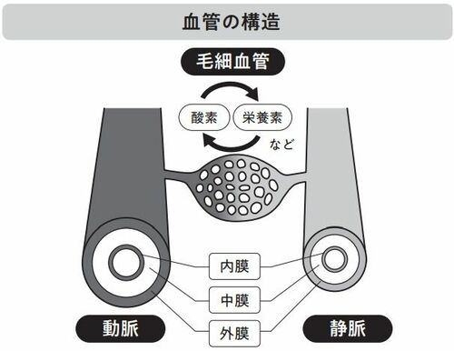 3種類の血管は構造にも違いがあり、動脈と静脈は、血管を守る「外膜」、血管を伸び縮みさせる「中膜」、血管の中を通る血液と直接触れる「内膜」の3層構造で、毛細血管は内膜だけの1層構造です。