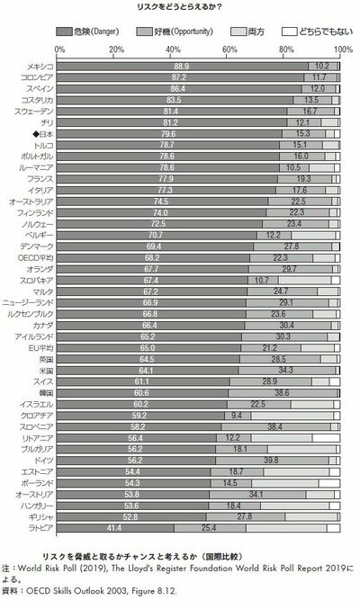 OECDの成人スキル報告書は、ロイズが2019年に行ったリスクに対する各国意識調査の結果を掲載している。これは、リスクを「危険」と考えるか「好機」と考えるかの違いを探った調査である(図1)。