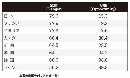 表1では主要先進国(G7諸国と韓国)のデータを抜き出した。日本が「危険」回答がトップ、「好機」回答が最低であるのが目立っている。