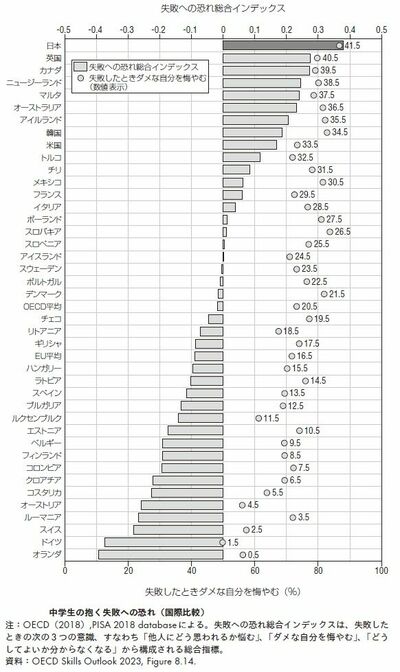 図2には、OECDのPISA調査から中学生の抱く失敗への恐れの調査結果を示した。関連3設問への回答を総合インデックスにした値では、日本が最も高く、オランダが最低、ドイツが下から2番目となっている。同インデックスを構成する3設問の1つである「失敗したときダメな自分を悔やむ」の回答率では、日本がやはりトップであり、最下位はドイツとなっている。