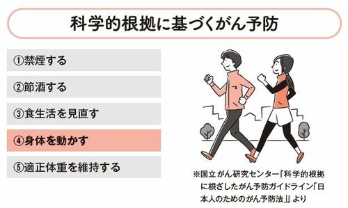 (4)身体を動かす。国立がん研究センターの報告によると、仕事や運動などで身体活動量が多い人ほど、何らかのがんになるリスクが低いようです。
