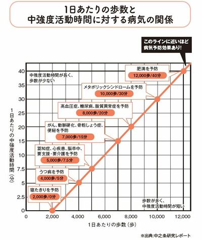 中之条研究では、1日あたりの歩数と中強度活動時間に対する病気の関係のグラフ(下図)のように、7000歩/中強度活動15分を超えると、がんの発症リスクが大きく下がることが明らかになっています。