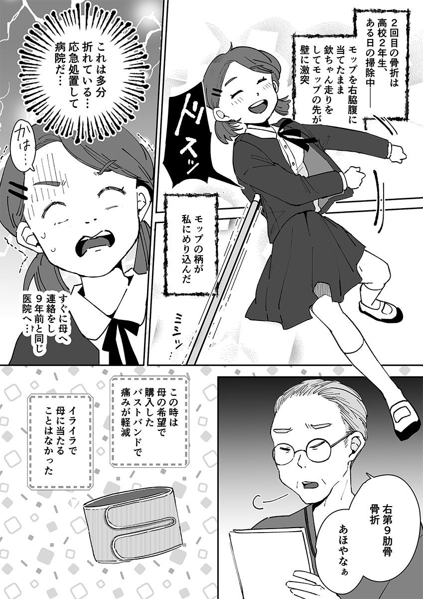 2回目の骨折は、高校2年生の時。放課後の掃除当番で、体育館の床のモップ掛けをしていた。つまらない作業を少しでも楽しくしようと考えた私は、モップの柄の先を右の脇腹に当てて右方向へ「欽ちゃん走り」をしてみた。