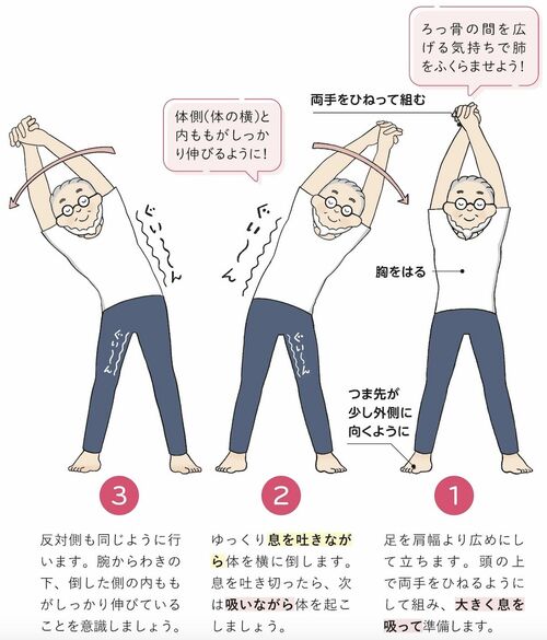 朝のだるさは自律神経の乱れが原因であることも多いため、朝一番で、しっかり体の横を伸ばしておきましょう。