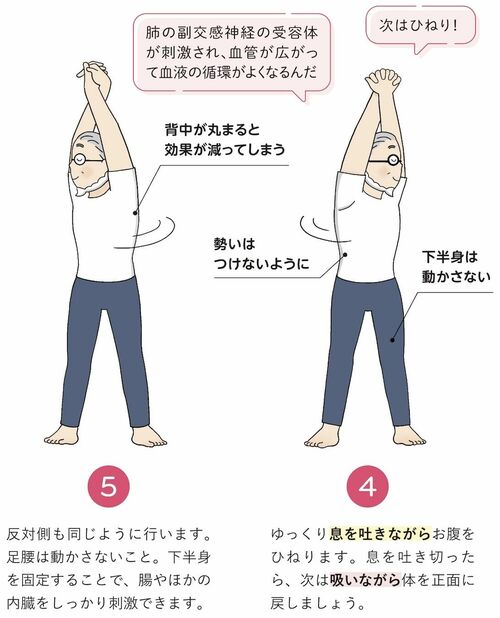 かまた体操は、体をまっすぐに伸ばした姿勢でお腹をひねることで、よりダイレクトに「ひねり」を腸に伝え、腸のぜん動運動を促します。