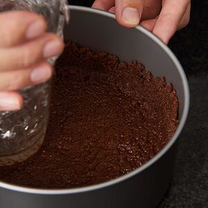 (3) 型に(2) の7~8割を押し固めながら側面の高さが約2cmになるよう敷きつめ、冷蔵庫で冷やしておく。