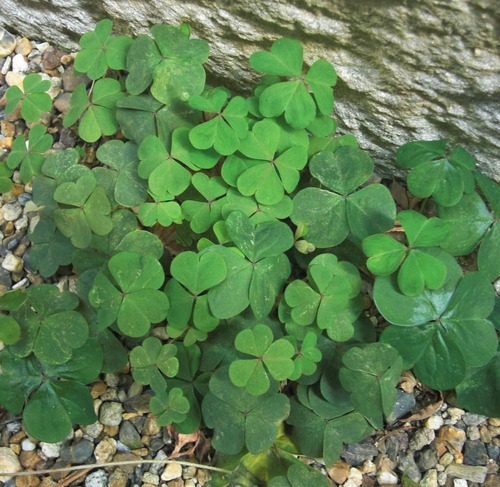 カタバミの仲間に、ムラサキカタバミがあります。この植物も、カタバミ科に属し、南アメリカが原産地とされる帰化植物です。市街地の人家近くの路傍や石垣の間などに生育します。カタバミより一回り大きい3枚のハート形の小葉が特徴的です。地下に球根のような鱗茎(りんけい)が増えて、繁殖します。
