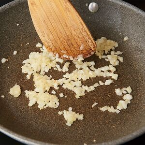 (1) 中火で熱したフライパンにバターを入れ、みじん切りにした玉ねぎが透き通るまで炒める。