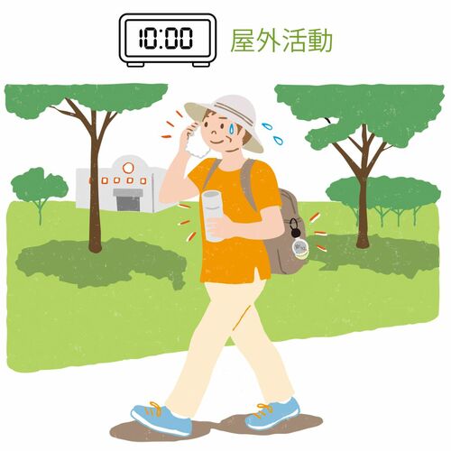 「外出は午前中、できるだけ早めの時間に。つばの広い帽子や日傘で頭を直射日光から守りましょう。サンバイザーはNG。水分補給はできれば経口補水液を。汗は濡れタオルで拭きます。熱中症計を携帯し、警戒表示されたら木陰や室内へ」