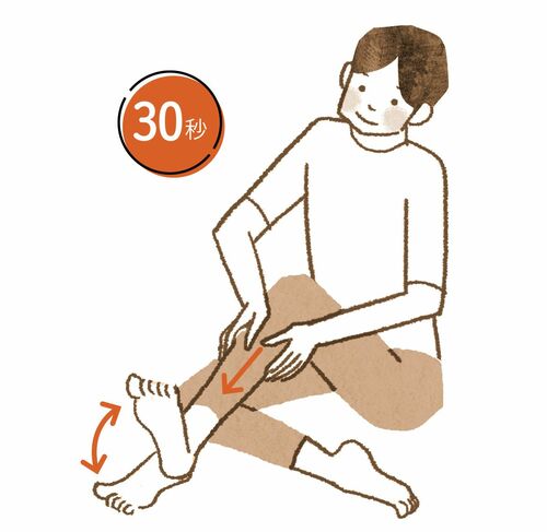 (3)ひざ下から足首まで少しずつ位置を変えて押しながら、足首を曲げ伸ばしする。反対側も同様に行う