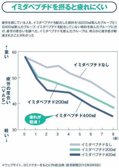 これに対し、イミダペプチドは細胞の酸化を防ぐ働きがあり、体内に摂取すると疲労が軽くなったり、疲れにくい体になることが知られています(下のグラフ)。