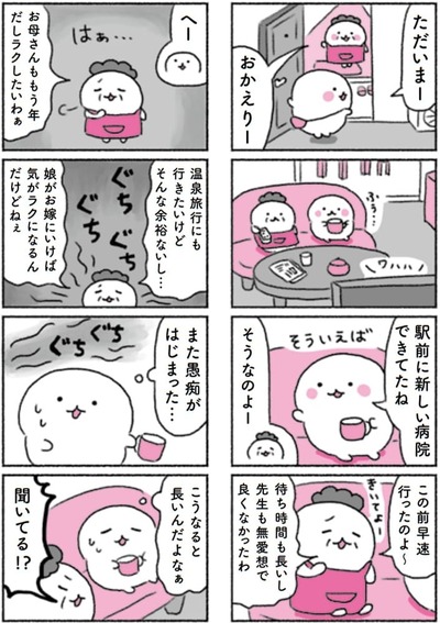 また母の愚痴が始まった…… <イラスト:植月えみり 『精神科医Tomyの自分を大切にする習慣』より> すべての写真を見る 『精神科医Tomyの自分を大切にする習慣』(著:精神科医Tomy イラスト:植月えみり/フォレスト出版) ぐちぐち… ぐちぐち… 「また愚痴がはじまった」 「こうなると長いんだよなあ」 「聞いてる!?」と言われても…
