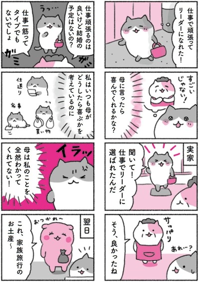 仕事でリーダーになれたのに…… 仕事でリーダーに! 母に言ったら喜んでくれるかな? <イラスト:植月えみり 『精神科医Tomyの自分を大切にする習慣』より> すべての写真を見る 『精神科医Tomyの自分を大切にする習慣』(著:精神科医Tomy イラスト:植月えみり/フォレスト出版) 「そう、よかったね」ってさっぱりした反応 母は私のこと、全然わかってくれない!