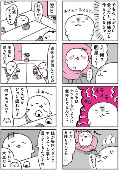 こっちはケンカしないように我慢してるのに…… 妹のマウントにイラつくけれど 姉妹だし仲良くしなきゃ… でもイライラが募って <イラスト:植月えみり 『精神科医Tomyの自分を大切にする習慣』より> すべての写真を見る 毎回イラッとするような事を言ってくるんだよね…