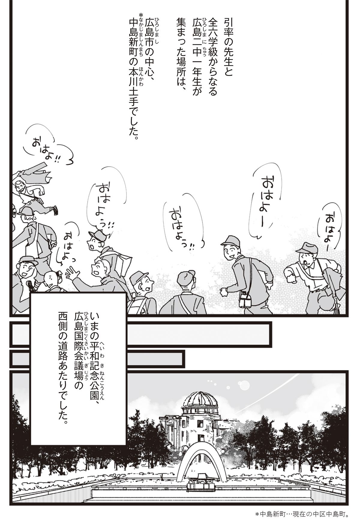 1945年8月6日、雲ひとつない夏の朝。空襲で火事が燃え広がるのを防ぐ、建物の解体作業のために集められていた広島二中一年生の上空で原爆が爆発。そこにいた320余名の生徒たち、全員が命を落とした。