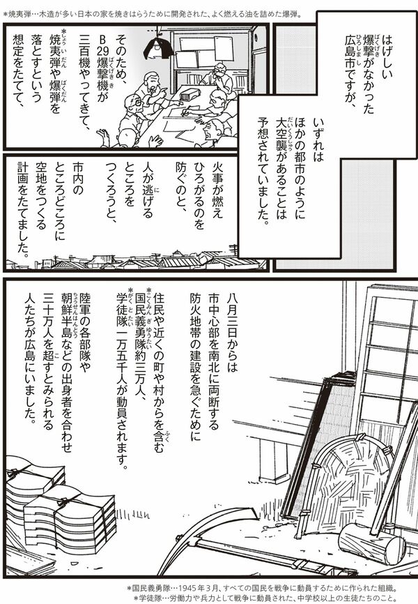 広島二中一年生の作業 大空襲を受けることを予見し、ところどころに空き地をつくる計画が進んでいた広島市内。 特に市中心部を南北に両断する防火地帯の建設が急がれ、八月三日からは、数万に及ぶ国民義勇隊や学徒隊の動員が行われました。↓↓↓ 『漫画 いしぶみ 原爆が落ちてくるとき、ぼくらは空を見ていた』(著:広島テレビ放送、サメマチオ/ポプラ社)