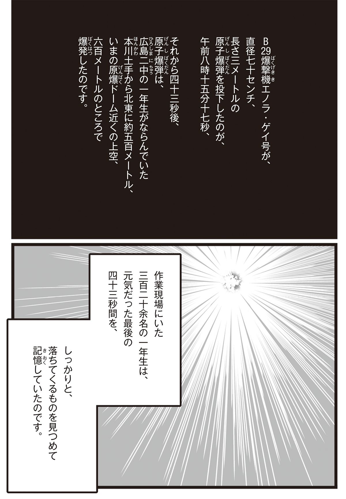 1945年8月6日、雲ひとつない夏の朝。空襲で火事が燃え広がるのを防ぐ、建物の解体作業のために集められていた広島二中一年生の上空で原爆が爆発。そこにいた320余名の生徒たち、全員が命を落とした。