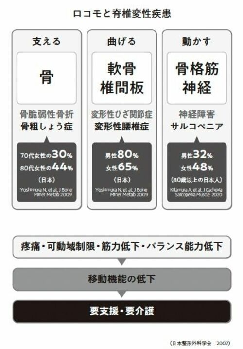 掲載した資料のとおり、70代女性の30%、80代女性の44%が骨粗しょう症に、男性の80%、女性の65%が変形性腰椎症に、80歳以上の男性の32%、同じく女性の48%がサルコペニアに、それぞれなるというデータがあります。