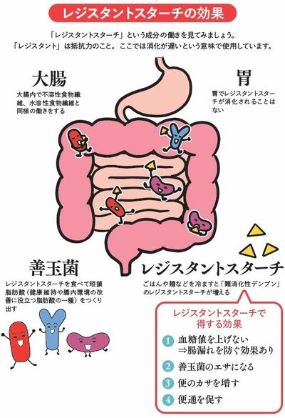 「レジスタントスターチ」は簡単にいえば、消化されにくいデンプン「難消化性デンプン」のこと。糖質の一種なのに、不溶性食物繊維(水に溶けにくい食物繊維)と水溶性食物繊維(水に溶けやすい食物繊維)の2つの特徴をあわせ持っていて、胃や小腸で消化されずに大腸まで届きます。そして大腸にいる善玉菌のエサになってくれるのです。結果、便のカサが増え、便通が良くなるという効果があります。