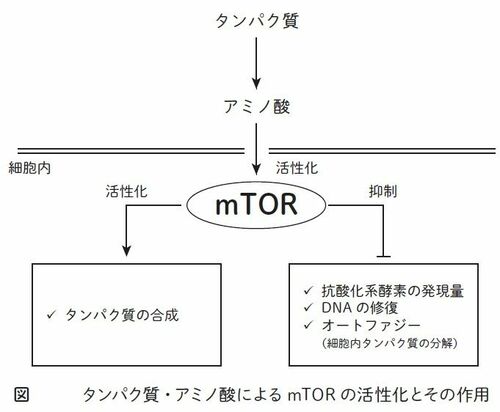 このmTORは、骨格筋においてタンパク質の合成を高める作用をもつ一方で、活性酸素による影響を予防・抑制する酵素(抗酸化系酵素)の量を減少させたり、DNAの修復を阻害したりする作用をもちます(10)。このように、タンパク質を多量に摂取した場合には、mTORという分子を介して、プラスとマイナスの両方の影響が生じると考えられています。