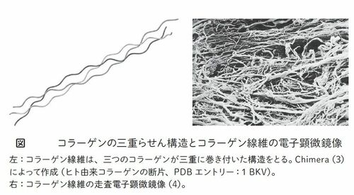 コラーゲンは、グリシン─X─Yという三つのアミノ酸が繰り返して連なった鎖(ポリペプチド鎖)からなるコラーゲンα鎖が、同じ向きに3本より合わさったものです。なお1型コラーゲンの場合、Xの位置にはプロリン、Yの位置には4─ヒドロキシプロリン(プロリンにヒドロキシ基が修飾したもの)である場合が多いです。この構造は、コラーゲン三重らせんと呼ばれ、さらに他のコラーゲン分子と集合して、大きなコラーゲン線維が形成されます(下図)。