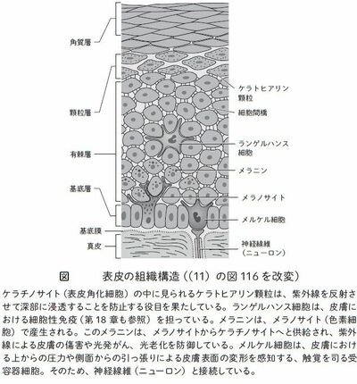 一方、皮膚に直接コラーゲンペプチドを塗ることで、皮膚の老化を抑えることはできるのでしょうか? 私たちの皮膚は、真皮と表皮からなり、表皮が肌の表面にあたります。表皮の厚さは約0.2ミリ程度です。表皮は、外側から、角質層、顆粒層、有棘層、基底層の四つの層から構成されています(下図)。