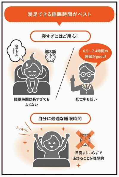 寝不足でも寝すぎでもない、自分に最適な睡眠時間を見つけましょう。自分で「ぐっすり眠った」と感じられるくらい寝るのがいいと私は考えています。