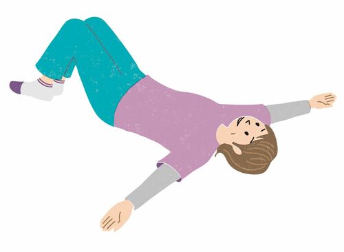 口から大きく息を吐きながら、両膝を閉じたまま右にゆっくり倒し、自然な呼吸で5秒キープ。ゆっくりもとに戻す。左側も同様に行う