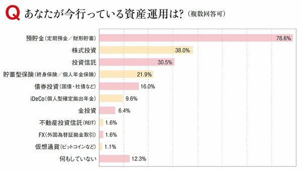 (画像:stock.adobe.com) すべての写真を見る Q.あなたが今行っている資産運用は?(複数回答可) Q.あなたが今行っている資産運用は(グラフを拡大) <2につづく> 【関連記事】 <続きはこちら>中高年女性の<資産運用を始めた理由>。金利が悪い、離婚したから、株式投資は老若男女フェアだから…。元手がないから始められないという声も お金が貯まる人に共通しているキーワードは「強制」!?30代純資産億超ママが教える<自然にお金が貯まる仕組みの作り方>【2025マネー記事セレクション】 投資は<増やした後>まで意識を。30代資産1億達成ママ「やめ時を間違えると運用の成果が大きく低下。なのでオススメは圧倒的に…」【2025マネー記事セレクション】