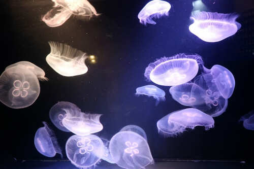 ・クラゲの水槽:背後を暗くした状態で、サーチライトのように水槽の一部を明るくして、クラゲの稜線(輪郭)をくっきりと映し出す。