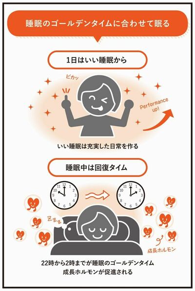 睡眠のゴールデンタイムは22時から2時の間です。この時間帯に深く眠ることができれば、成長ホルモン(あらゆる年齢で分泌されます)が多く出ます。すると、その日の疲労がいやされ、しっかりと体調を回復できるようになります。