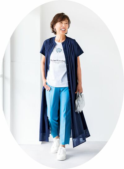 (アレンジ2) ボタンを全開にすればTシャツに羽織るのにぴったり。体形カバーにも最適