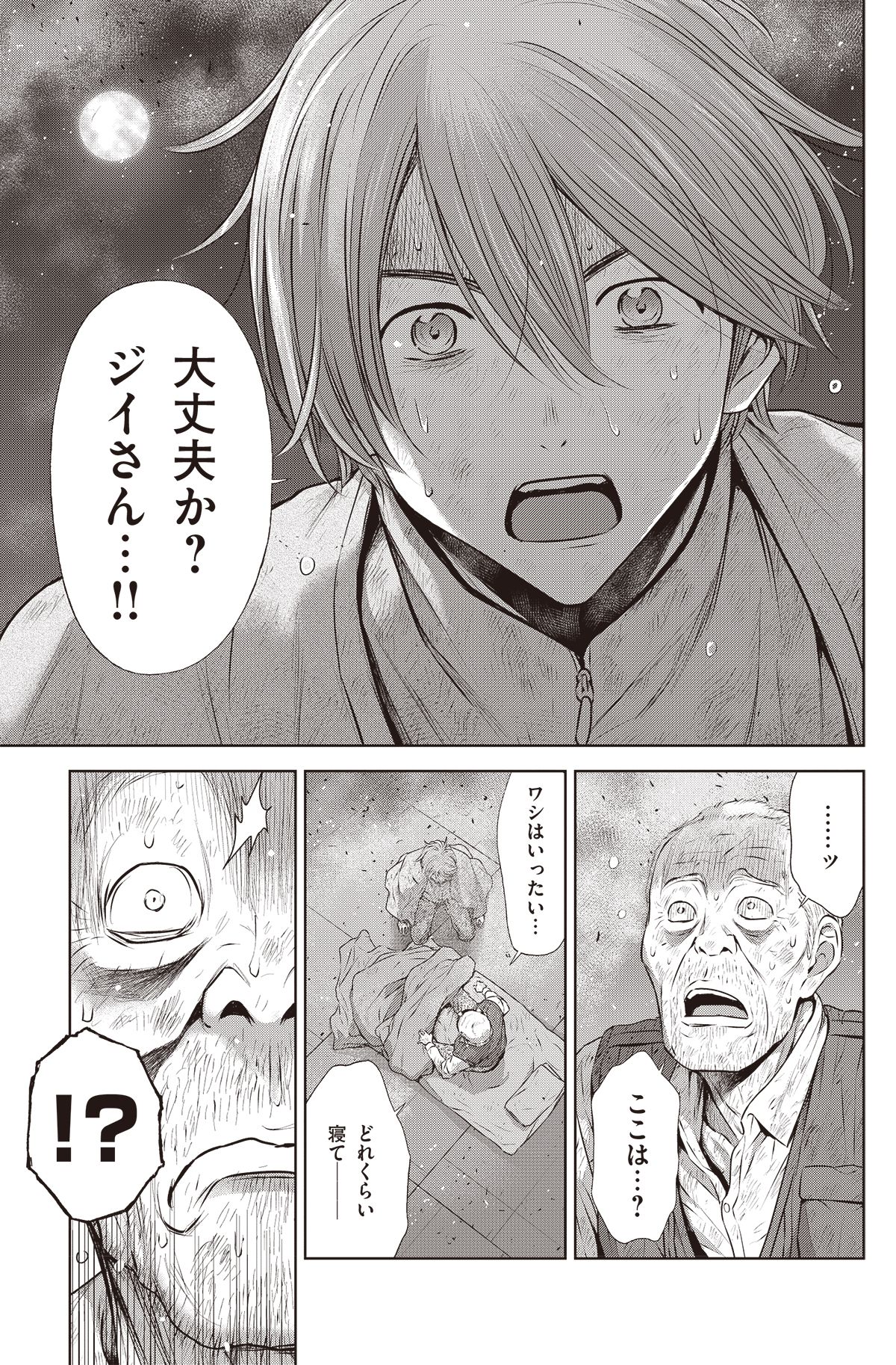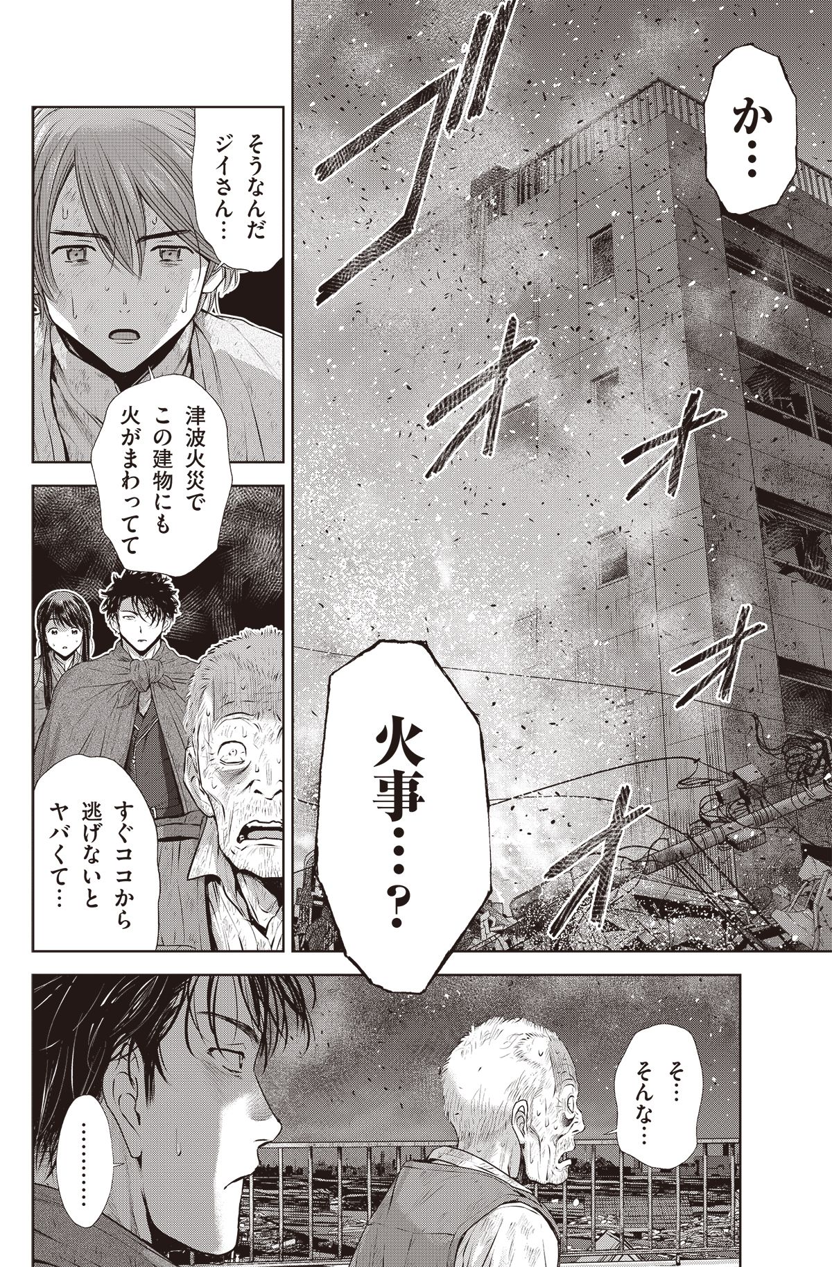 大丈夫か?ジイさん…!! 【5】 【6】 巨大地震で起きた津波に町が飲み込まれた中、なんとかビルの屋上に辿り着いた西藤とジイさん。 しかし津波をきっかけに新たに起こった火災【津波火災】により、逃げ込んだはずのビルが、火に包まれてしまい…。