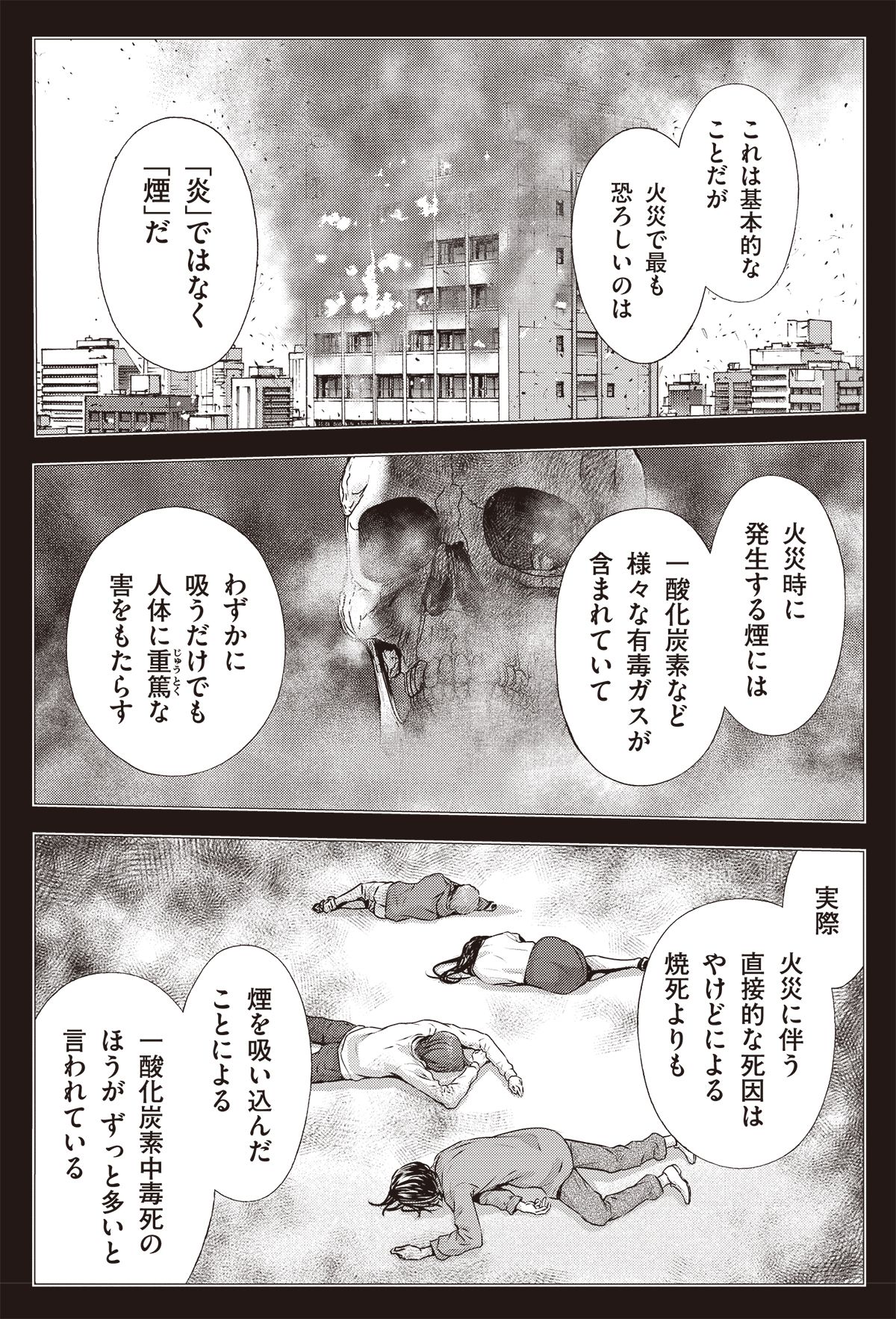 実際、火災に伴う死因としてはやけどより、一酸化炭素中毒などのほうがずっと多いといわれている。