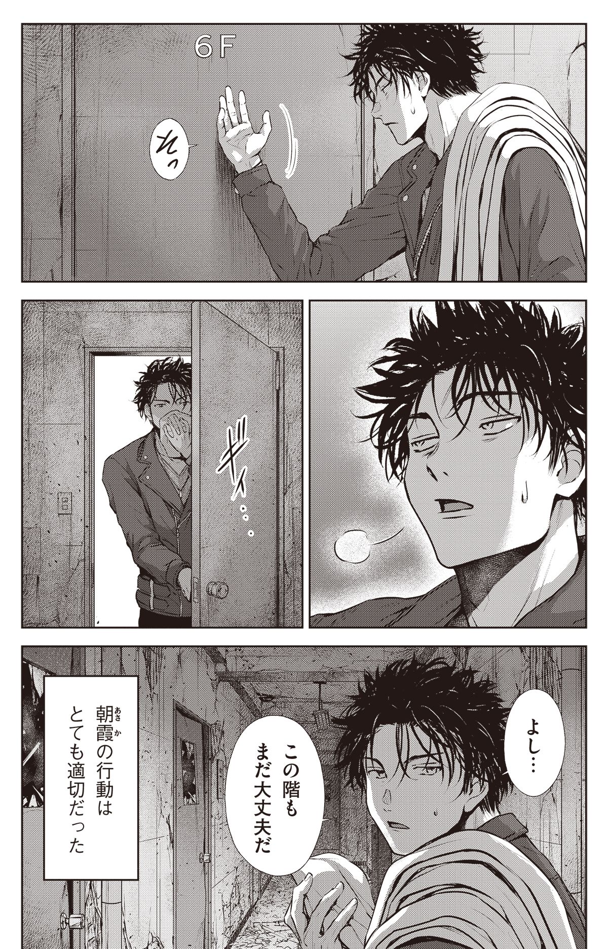 津波火災で燃え盛るビルからの脱出を試みる西藤、ジイさん、許斐、朝霞の4人。