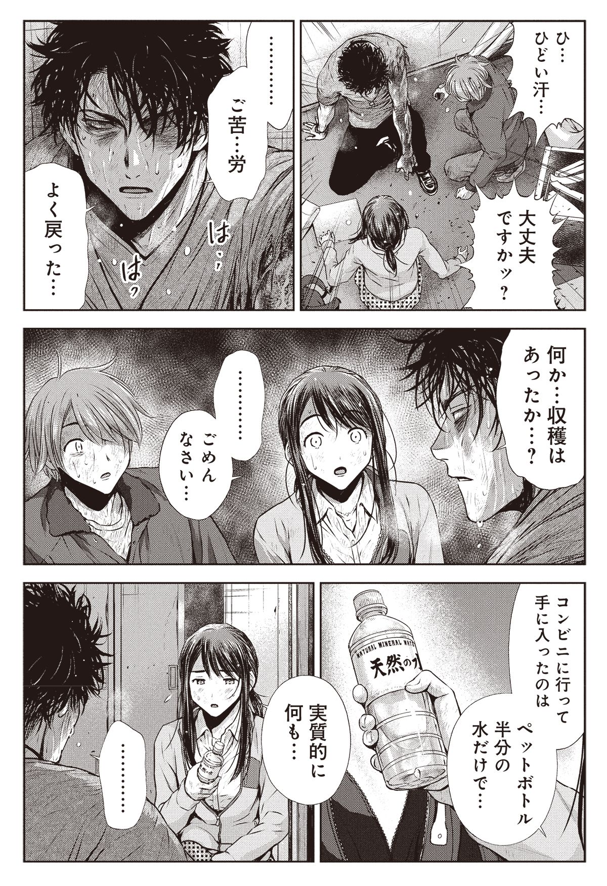 朝霞をその場に残し、崩壊した街中のコンビニエンスストアで「ペットボトル半分の水」を見つけて戻ってきた西藤と許斐だったが…。