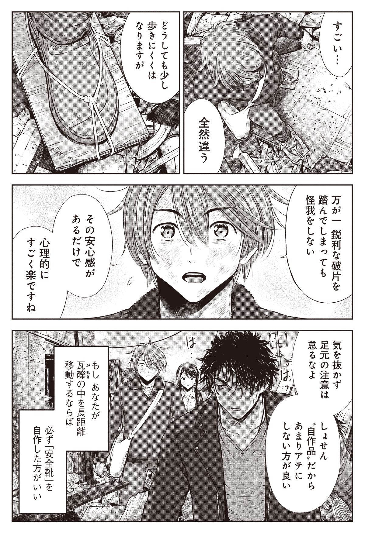 瓦礫の中を進むにあたり、「安全靴」の自作を促した朝霞。