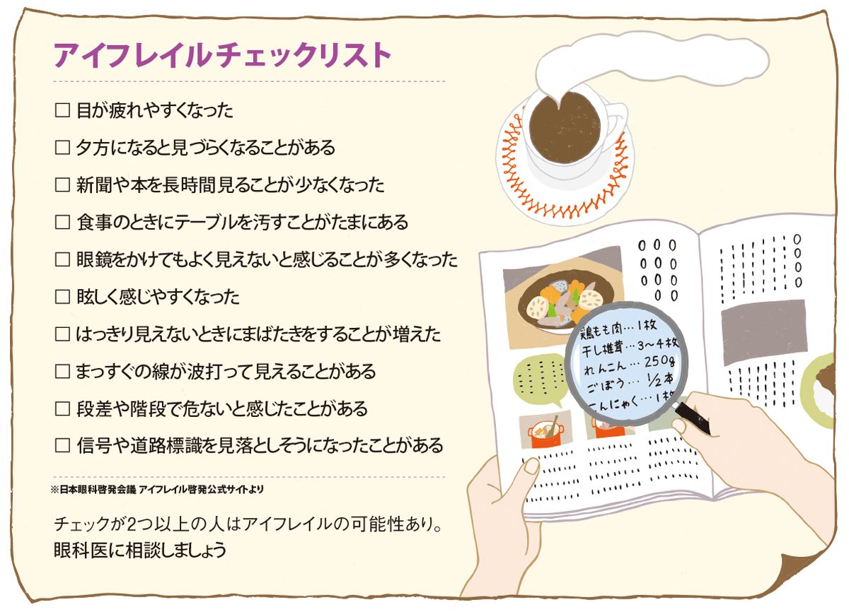 つまり、見えにくい状態を放置すると社会との接点を失い、健康寿命まで脅かすことになるのです。『以前より見えにくい』などの変化を感じたら要注意。下のチェックリストで目の状態を確認してみましょう」(深作先生。以下同)