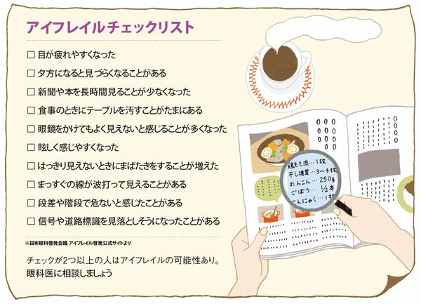 日常生活で活字を読むと目が疲れる、光を眩しく感じる、手元や足元が見えにくい……といった不調を感じることはありませんか? もしかしたら、「アイフレイル」が始まっているかもしれません。