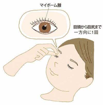 「ドライアイの85%は、まぶたの内側にあるマイボーム腺から出る皮脂の分泌不足が原因で起こります。ホットタオルで目元を温めてから、マイボーム腺の皮脂をゆるめるイメージで目頭側のまぶたをつまんで離しましょう。赤ちゃんの肌をつまむくらいのやさしいタッチで、指を少しずつ移動させながら目尻まで行います」