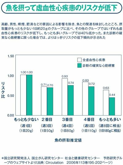 実際、魚をよく食べる人は、魚をあまり食べない人に比べて、心筋梗塞などの虚血性心疾患が少ないという研究があります。