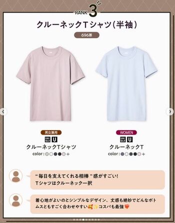 堂々の3位にランクインしたのは、ユニクロの永遠のベーシック「クルーネックTシャツ」。
