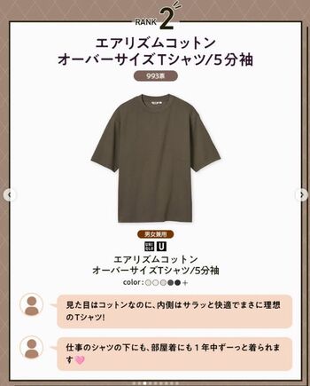 2位は、“名品T”として名高い「エアリズムコットンオーバーサイズTシャツ/5分袖」。