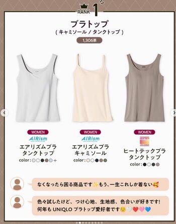 キャミソールとタンクトップタイプの使い分けで、どんなスタイルにもフィット。夏は一枚で、冬はインナーとして、とにかく“365日出番がある”ことが人気の秘密のようです。