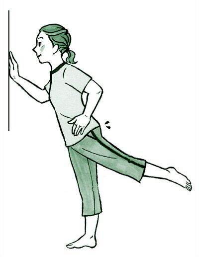 2)股関節を軸にして、片足を後ろに蹴り上げる。左右10回ずつ。