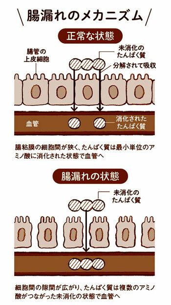 その大きな原因となるのが「腸漏れ」(リーキーガット症候群)です。腸は栄養吸収の要。その入り口が小腸の上皮粘膜(腸粘膜)です。健康な腸粘膜は細胞が細かい網目状に結合しているのですが、粘膜が炎症を起こすと、その網目が広がってしまいます。