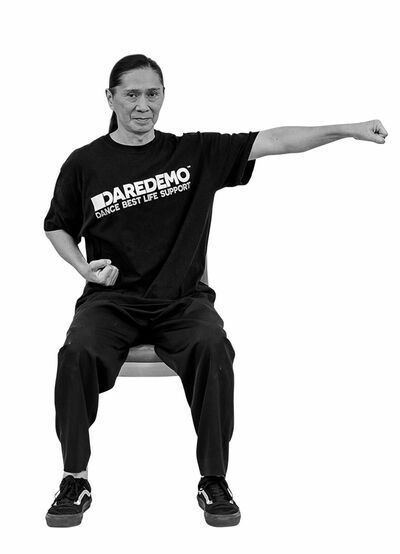 背もたれに背をつけて座り、足を肩幅に開く。立ったときと同様に、体幹を意識しながらパンチ